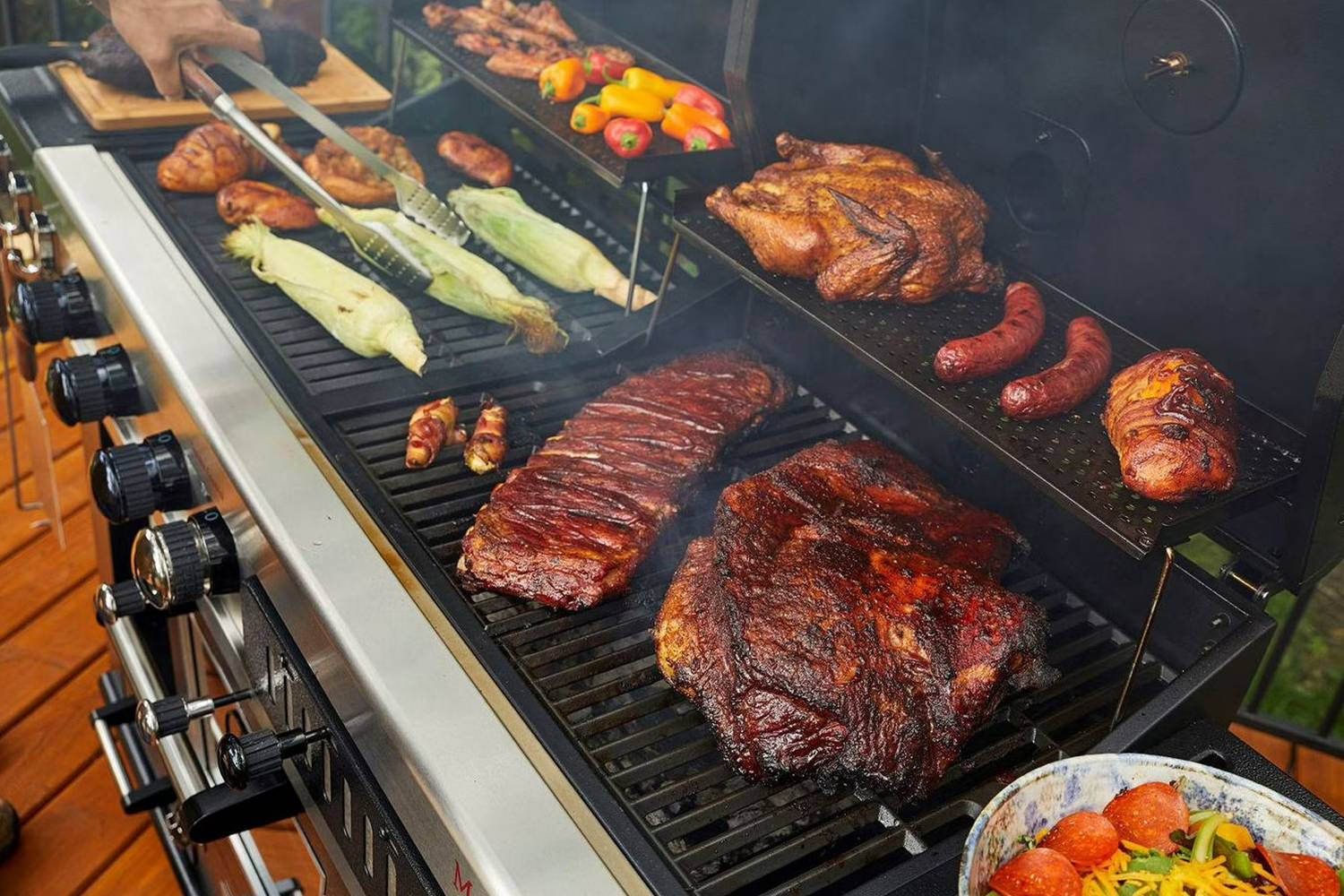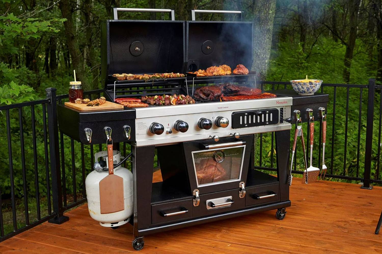 Built for durability, it boasts porcelain-coated cast iron grates, stainless steel burners, and heavy-duty steel construction. Precision cooking is easy with a built-in temperature gauge, adjustable dampers, and front-access wood chip tray. Plus, enjoy added convenience with storage drawers, tool hooks, and locking castor wheels.